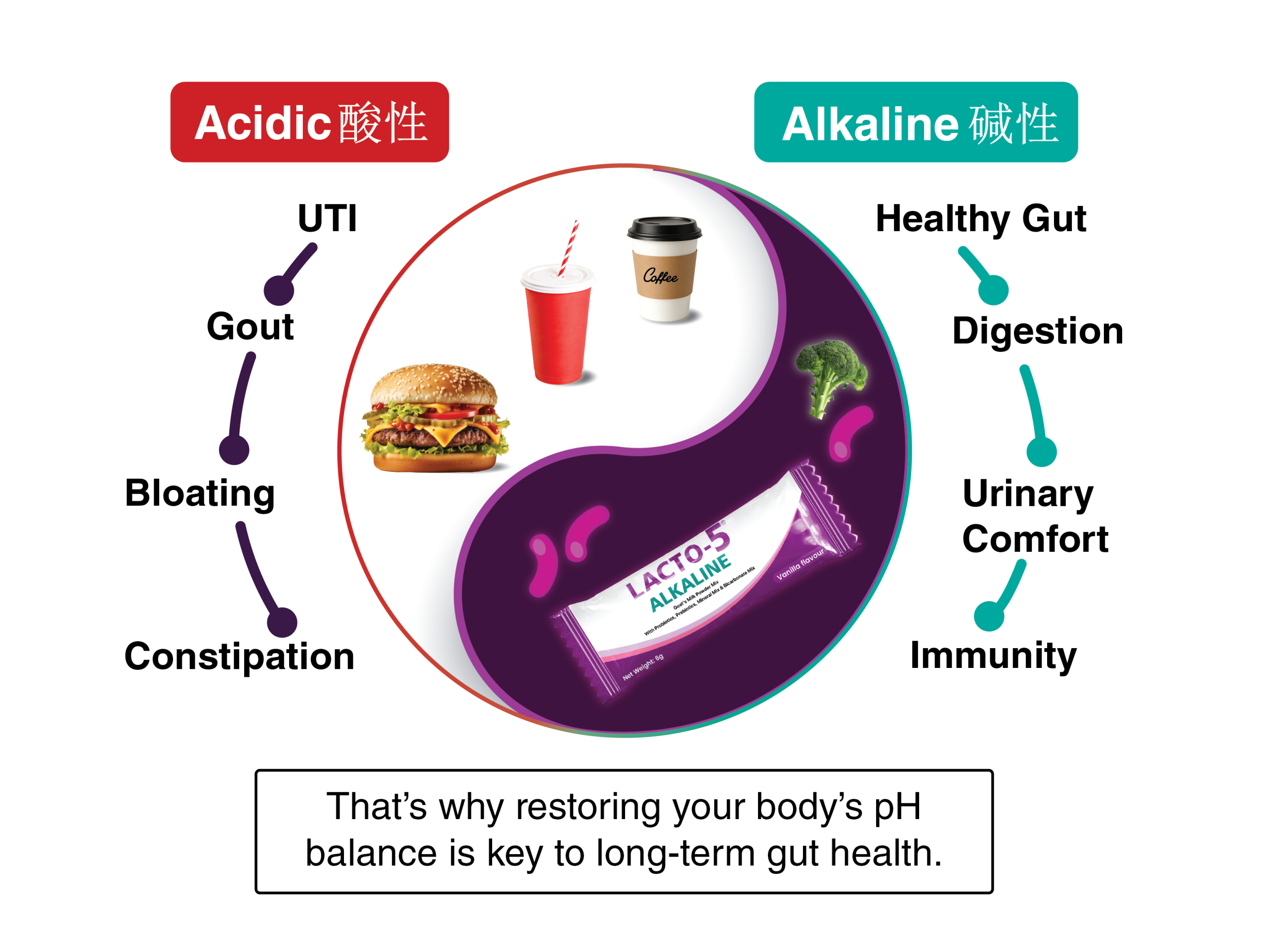 Introducing LACTO-5® ALKALINE — a revolutionary, patent-pending formulation designed to reduce the excess acidity in the body and naturally restore inner balance, just like the harmony of Yin and Yang — for better gut & urinary health and overall wellness from within!